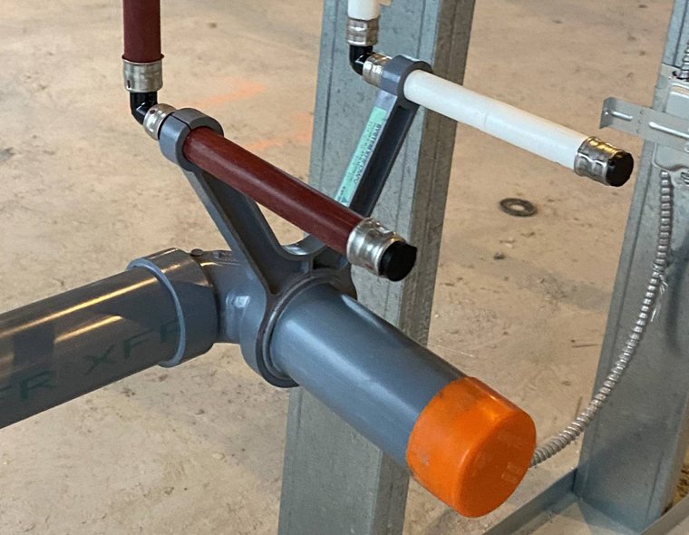 Le temps et l’argent ne sont plus gaspillés pour essayer de sécuriser et de fixer des conduites d’eau. Grâce à des soudures à l’aide de colle à solvant, le guide de conduite d’eau du Système XFR se fixe directement au raccord de conduites d’évacuation, tandis que les deux ouvertures CTS uniformes et symétriques de 1/2 po maintiennent les conduites d’eau en place. Pas besoin de bride d’aucune sorte.